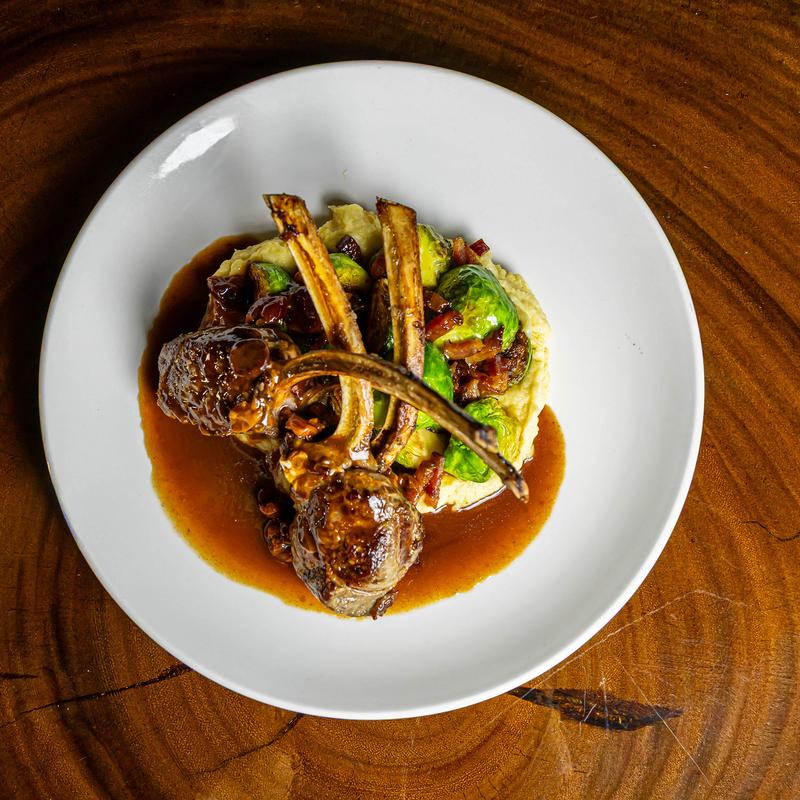 Maple bacon brussels, parsnip puree, and dried cherry demiglace.