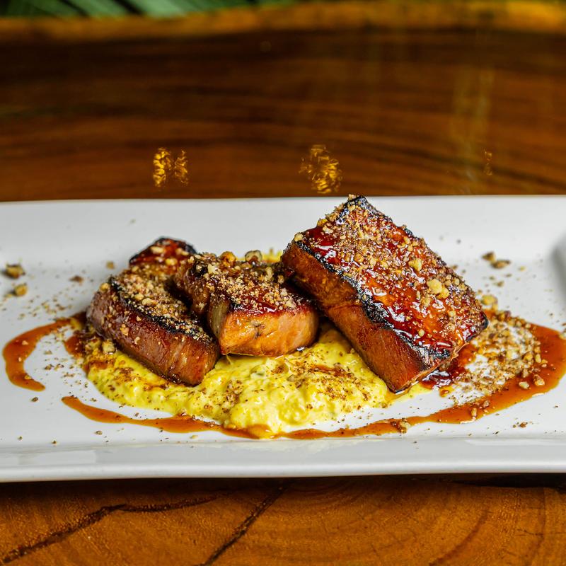 Jalapeno and sweet corn puree, Korean BBQ, and candied pecans.