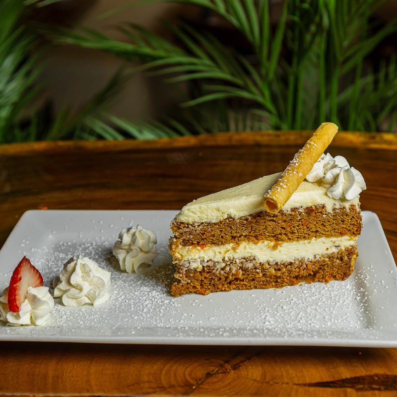 A large slice of classic carrot cake, topped with basil, cane sugar, and whipped cream.