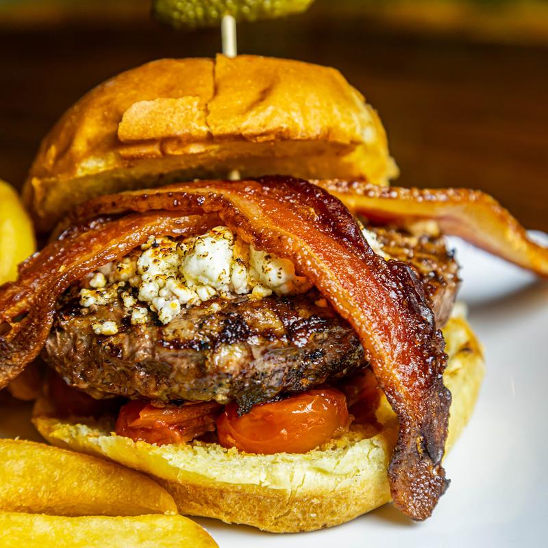 Elk, Venison, Wagyu, and Wild Boar ground meat, brûléed goat cheese, bacon, confit tomatoes, and French fries with a side of espresso ketchup.