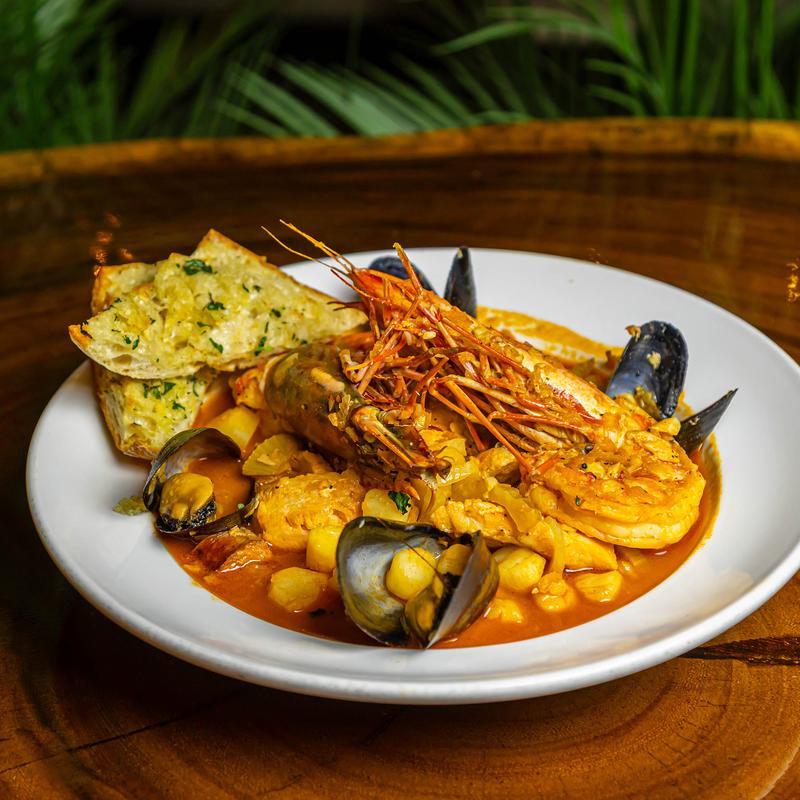 Bay scallops, large prawns, mussels, fresh fish, house-smoked sausage, potato, roasted fennel, tomato-saffron jus, and grilled toast points.